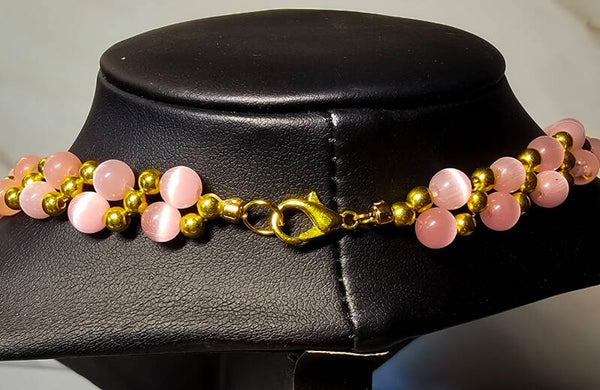 Strung with a graceful mix of shimmering pink cat eye beads and gleaming gold accents, this necklace is finished with polished gold hardware for a timeless, feminine touch.