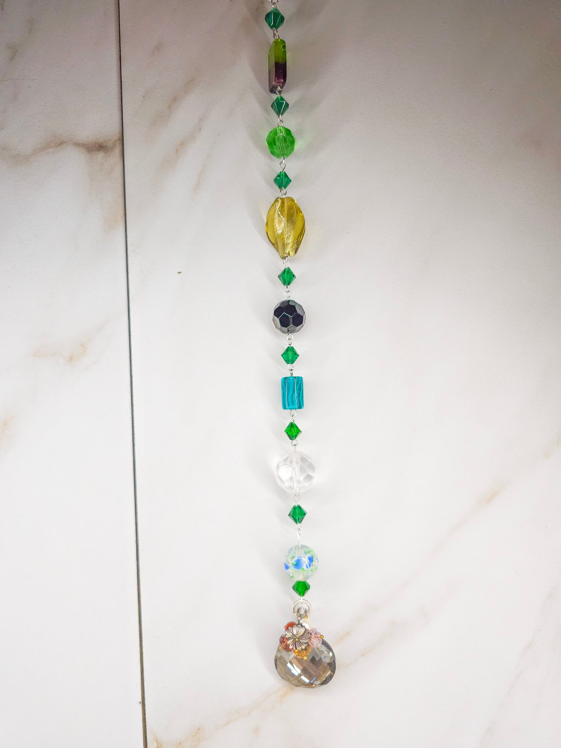 Bring a soft, colorful glow into your space with the Emerald Sky Suncatcher — a handcrafted piece designed to dance with sunlight and brighten any room. Every bead is thoughtfully selected to create a smooth, flowing gradient of greens, blues, and warm neutrals, culminating in a stunning faceted crystal that sparkles beautifully when illuminated by light.