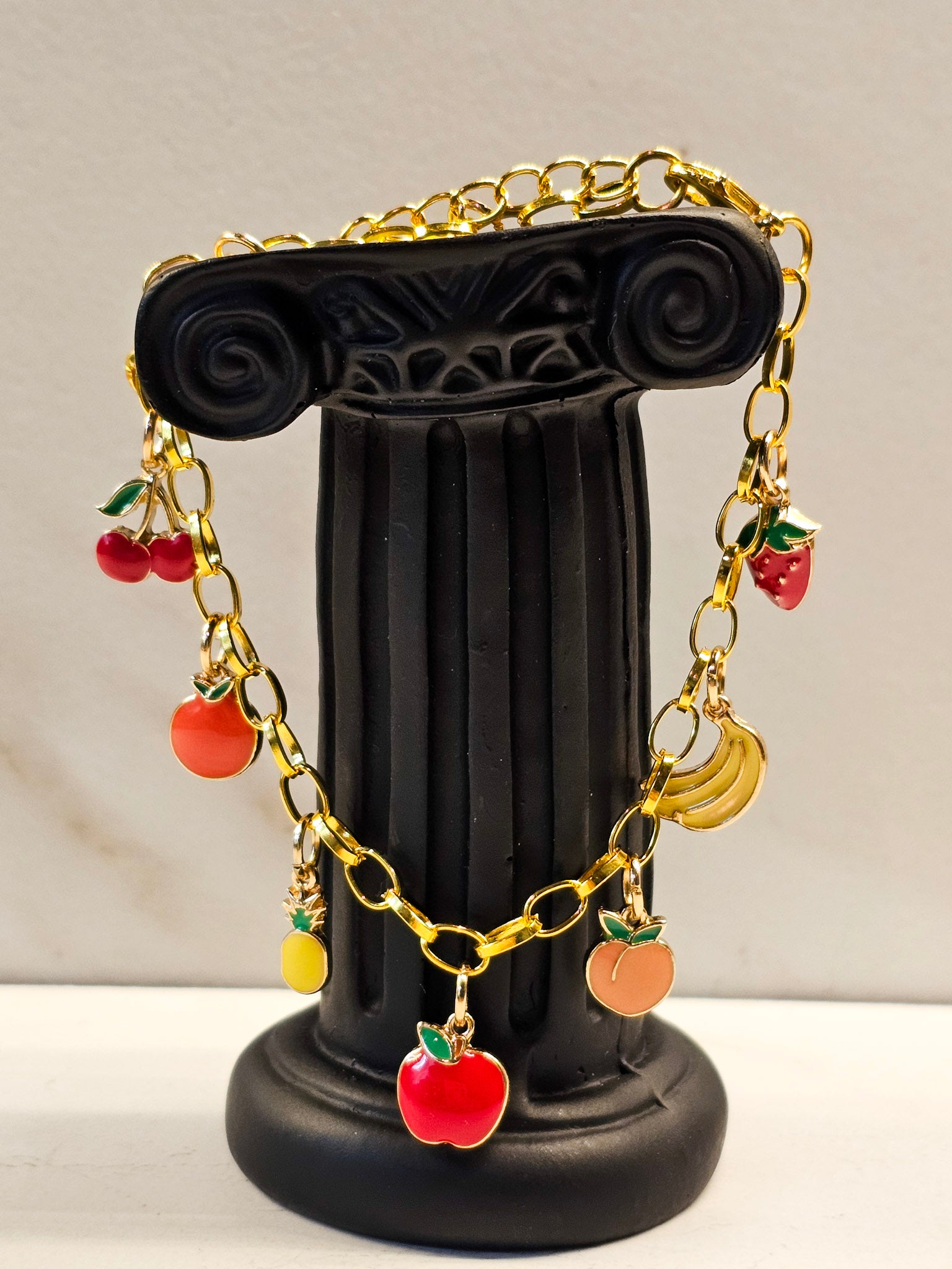 Bring a pop of color and fun to your style with this adorable Fruit Basket Charm Bracelet! Featuring a collection of vibrant enamel charms—juicy cherries, sweet strawberries, crisp apples, tropical bananas, and more—this gold-toned chain is bursting with personality. Perfect for adding a playful twist to any outfit, this bracelet is lightweight, comfortable, and full of cheerful charm.