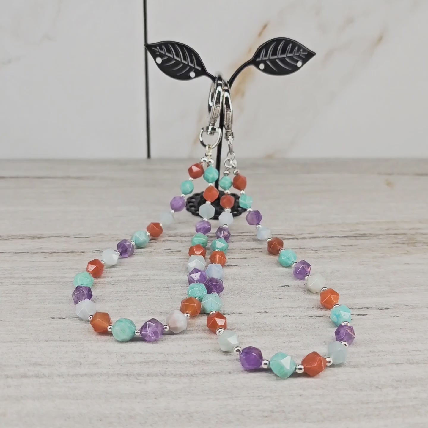 This piece features genuine amethyst, aquamarine, amazonite, and orange agate gemstones, each carefully chosen for its unique tone and subtle sparkle. The vibrant mix of purples, aquas, and sunlit orange beads creates a soothing yet joyful palette ā a perfect reflection of harmony in motion.