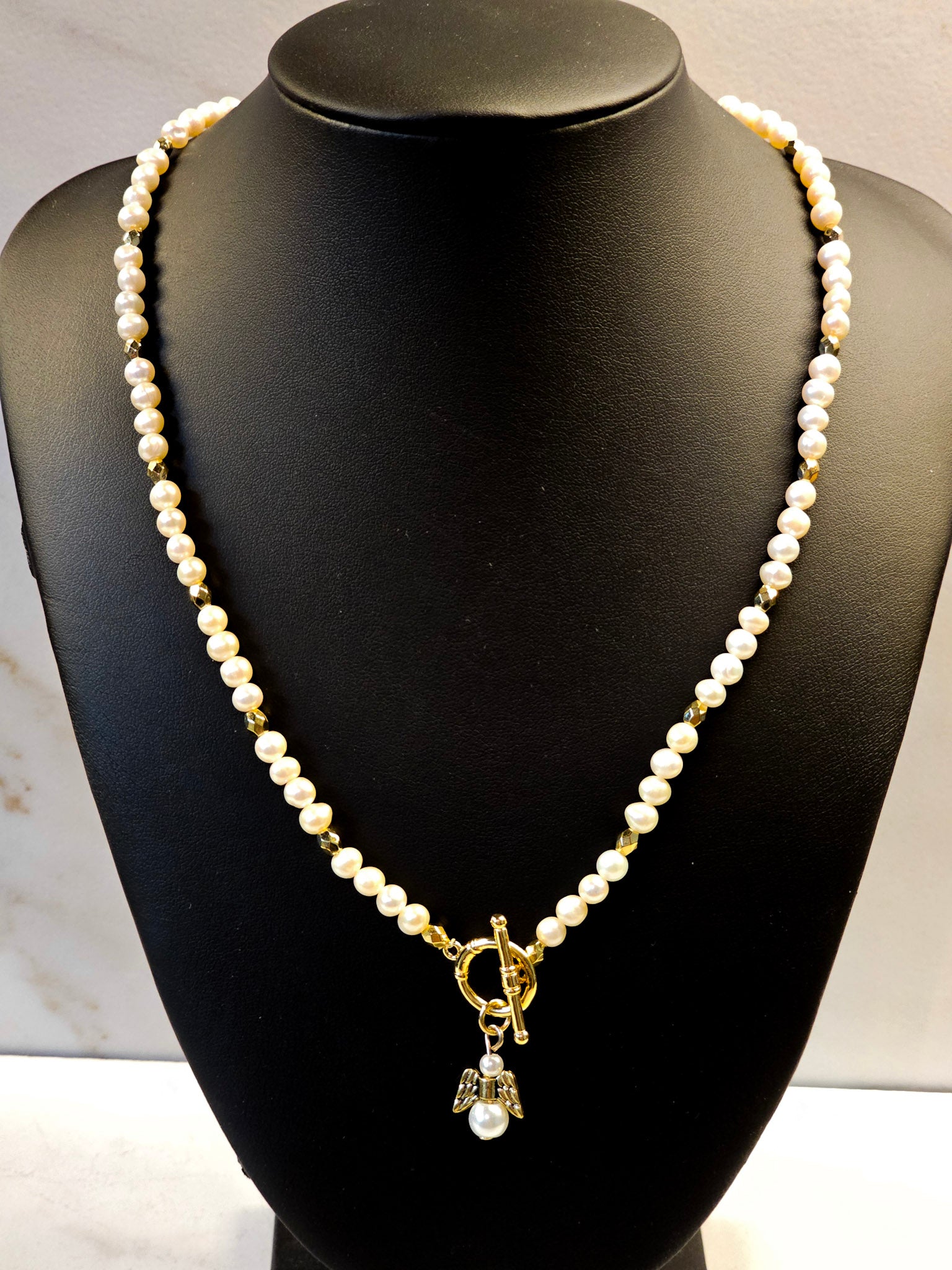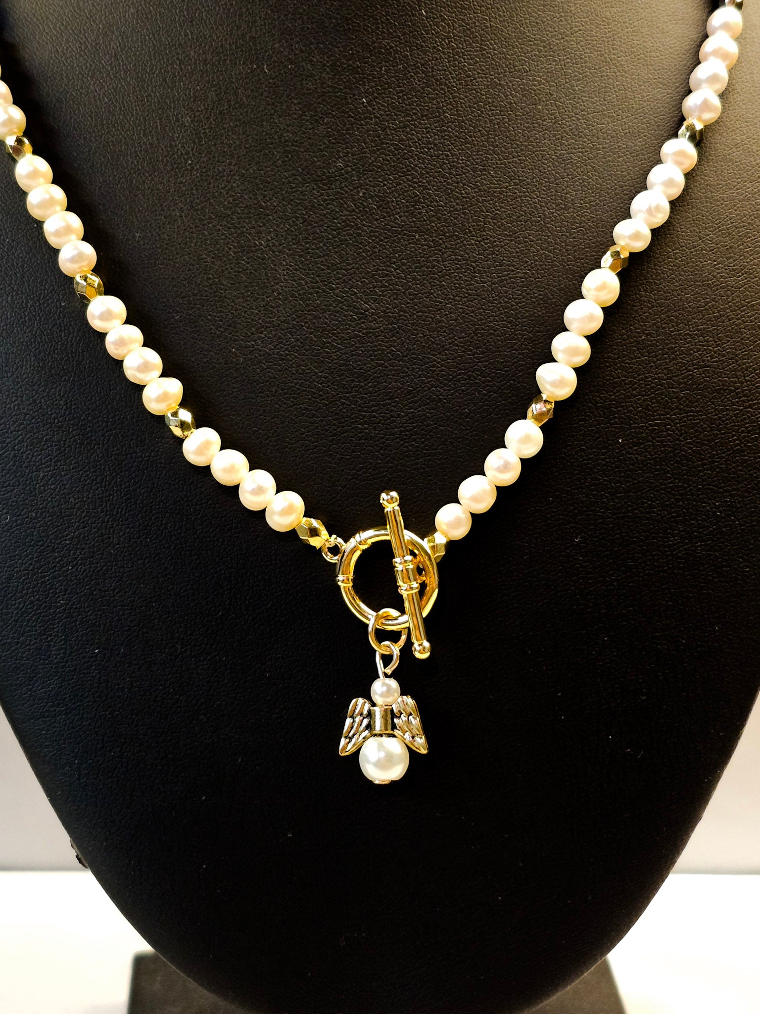 - Secure toggle clasp with angel charm centerpiece