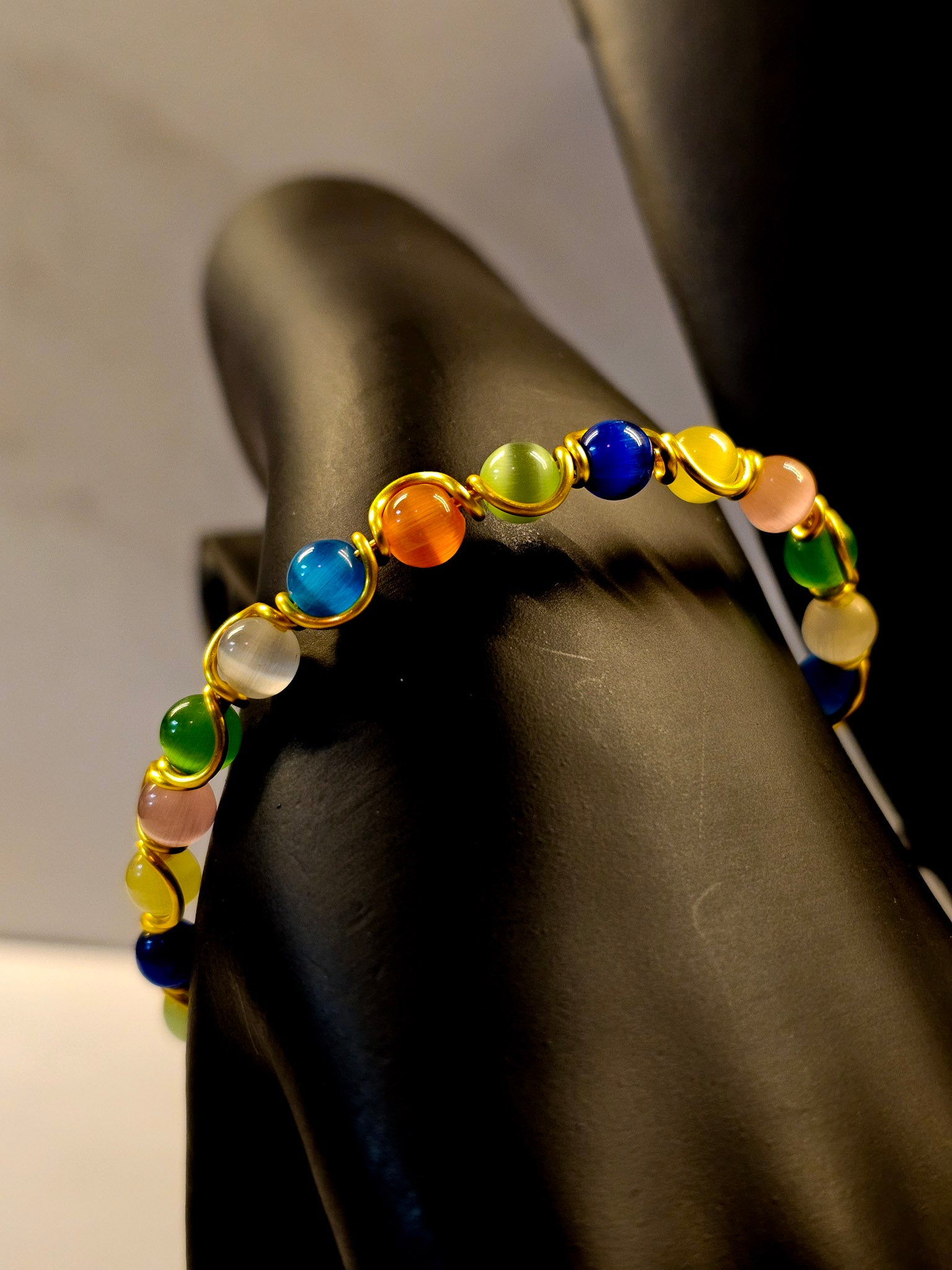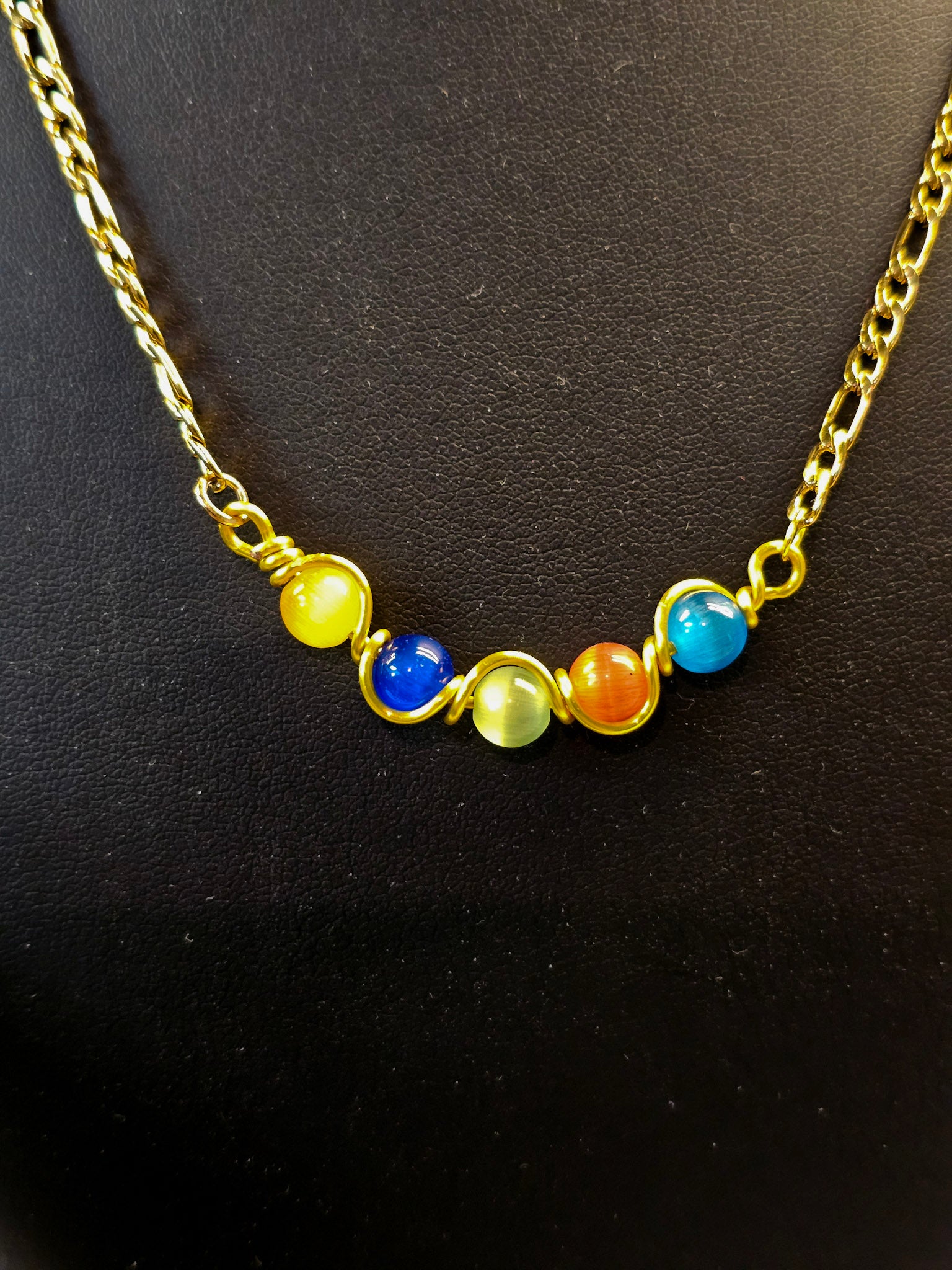 Each bead is chosen for its vivid color and soft inner glow, ranging through rich hues of blue, green, amber, and gold. Paired with warm gold-tone metal, the result is a vibrant yet refined aesthetic that transitions effortlessly from day to evening wear.