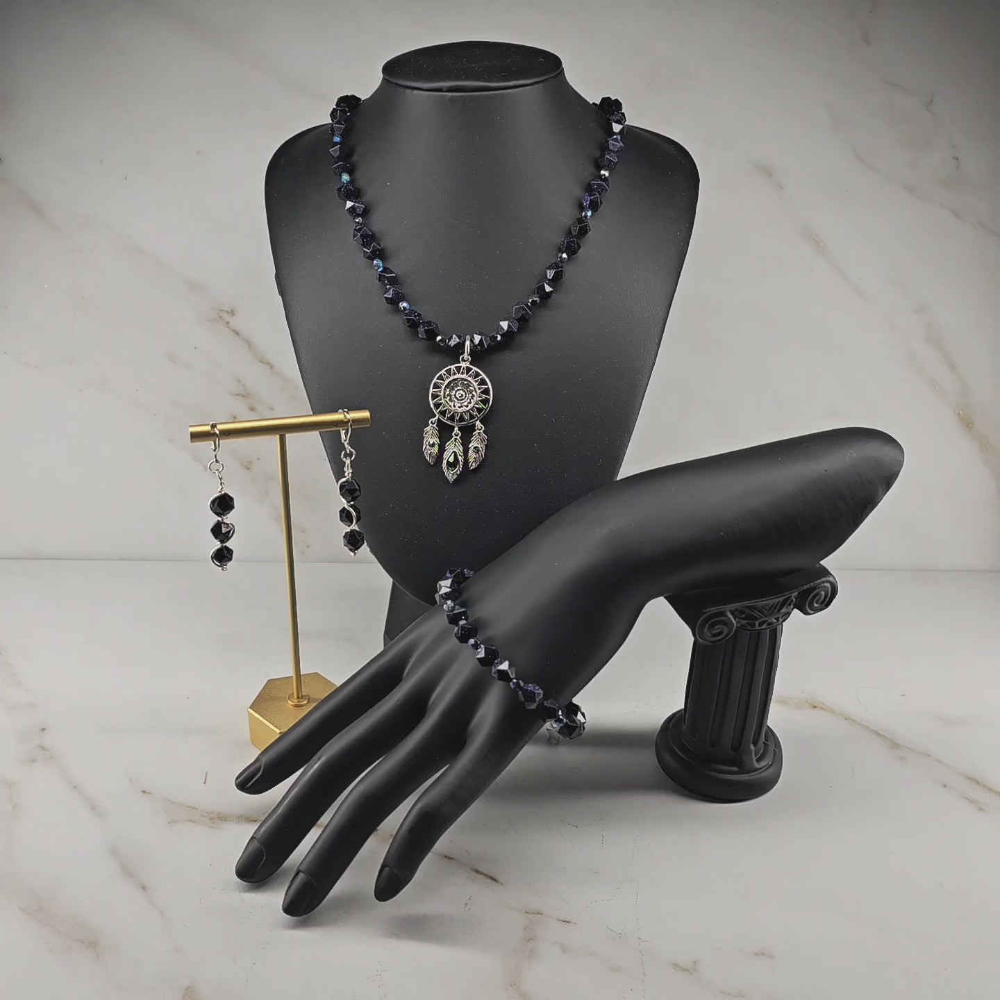 This handcrafted set combines navy blue goldstone beads — known for their subtle, starry shimmer — with faceted glass beads that add an extra touch of sparkle and movement. The dreamcatcher pendant serves as the heart of the design — a reminder to hold tight to the dreams that light your way.